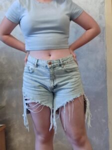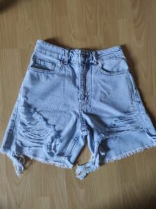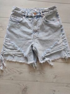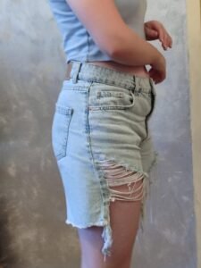 Овој женски фармерки шорц е изработен од издржлив и удобен деним материјал со светло сина боја. Има уникатен раскинат дизајн на предната страна, кој додава стилски и урбан впечаток. Работ е со необработени реси, што го прави идеален за лежерни летни изгледи. Шорцот има класичен крој со појас за ремен, копче и патент, како и повеќе џебови за практичност. Совршен е за секојдневно носење, прошетки и дружења