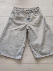 - Ова се модерни, oversized baggy тексас кјулоти во светлосина, излитена нијанса (light-wash denim). Нивниот екстремно широк и опуштен крој им дава удобен и лежерен изглед, додека скратената должина до средината на потколеницата ги прави идеални за летниот период. Со висок струк и класични пет џебови, тие се совршен избор за тренди и опуштени комбинации.