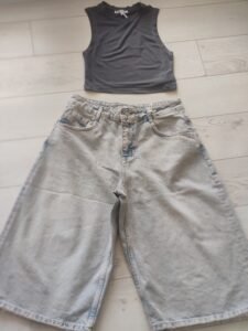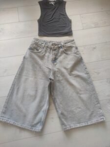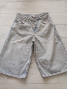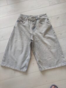 - Ова се модерни, oversized baggy тексас кјулоти во светлосина, излитена нијанса (light-wash denim). Нивниот екстремно широк и опуштен крој им дава удобен и лежерен изглед, додека скратената должина до средината на потколеницата ги прави идеални за летниот период. Со висок струк и класични пет џебови, тие се совршен избор за тренди и опуштени комбинации.